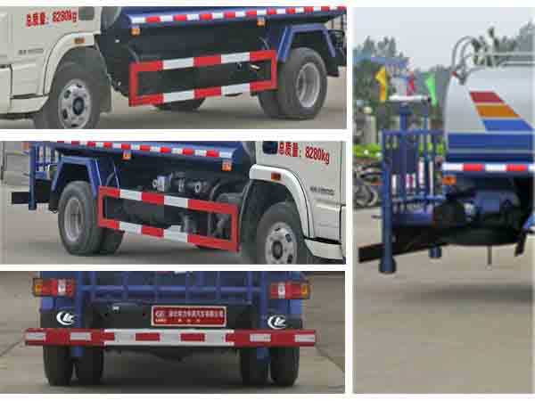 整車說明: 隨底盤選裝駕駛室。罐體有效容積:4.99立方米,運輸介質(zhì)為水,密度:1000千克/立方米,罐體外形尺寸(長/長軸/短軸)(mm):4100/1600/1050。防護材料:Q235A碳鋼,連接方式:左右側(cè)面及后下部防護均采用焊接連接,后部防護斷面尺寸(mm):100×30×5,后部防護離地高度(mm):500。