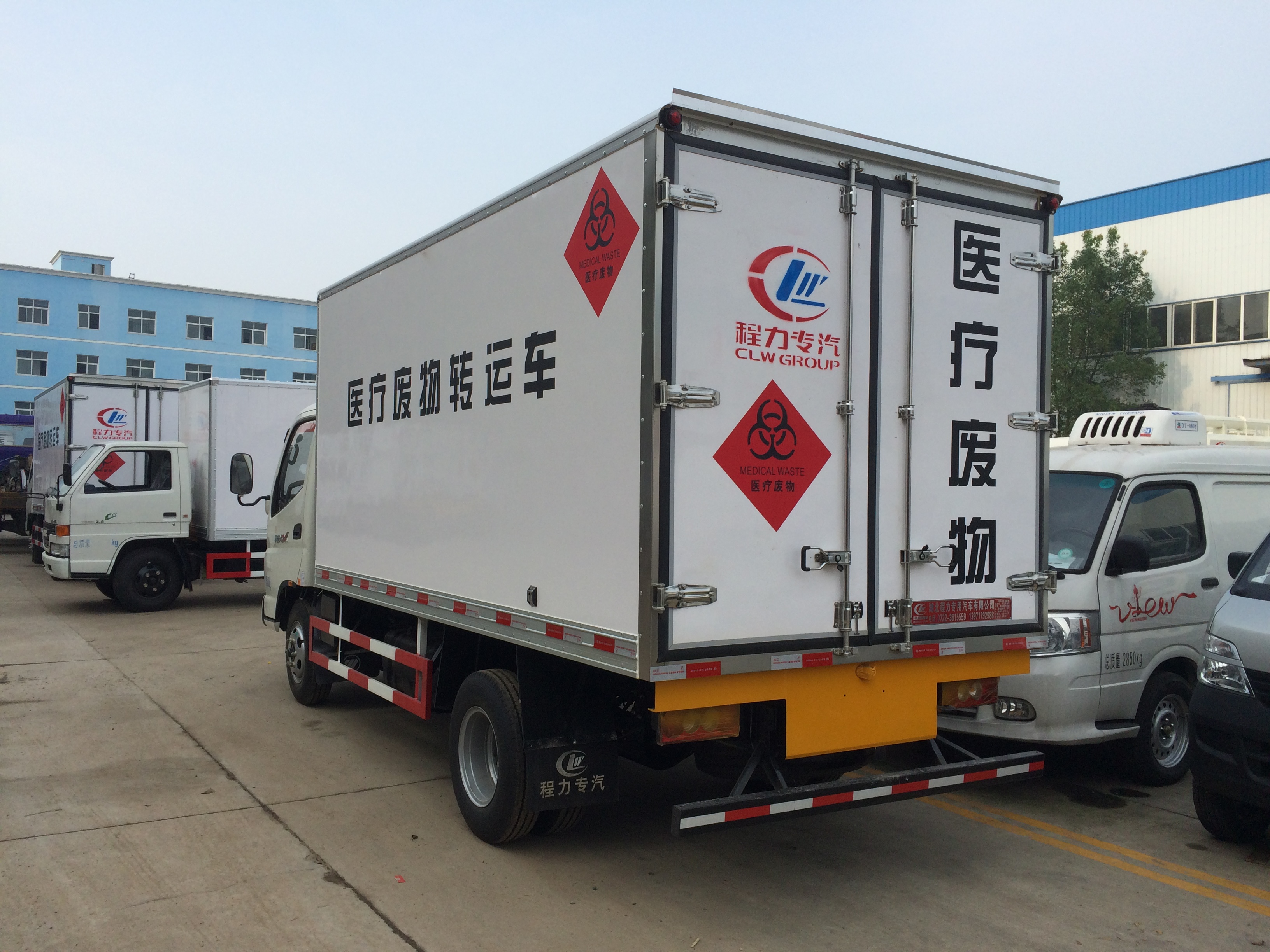 湖北程力專用汽車有限公司生產(chǎn)的醫(yī)療廢物運(yùn)輸車材質(zhì)采用外玻璃鋼、內(nèi)不銹鋼板,配紫外線滅菌燈,噴霧消毒裝置。雙開后門,車廂內(nèi)帶固定臥環(huán),廂內(nèi)陰角圓弧過渡。標(biāo)配零下5度冷藏機(jī)組。整車廂體密封無(wú)泄露,確保醫(yī)療器械在運(yùn)輸?shù)耐局胁蛔躺?xì)菌。