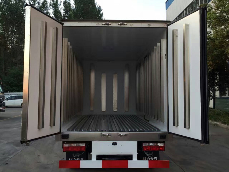 冷藏箱體尺寸長××高為:4000X1880X185012.48立方,廂體厚度為8厘米。內(nèi)外板材采用冷藏車專用玻璃鋼,(可反射陽光),中間夾層為聚氨酯發(fā)泡隔熱材料,(防火阻燃隔熱)大型千噸壓力機(jī)壓制而成,配置箱體全為不銹鋼鎖件,不銹鋼包角,不銹鋼門框,帶有頂燈及防撞塊。我廠的冷藏保溫車保溫材料選用進(jìn)口級(jí)別XPS,吸水率≤1,導(dǎo)熱系數(shù)≤0.028W/mk,抗壓≥150Kpa,密度3045kg/m3,使用國際上最為先進(jìn)的第五代全封閉聚氨酯板塊粘接結(jié)構(gòu),廂板表面材料有玻璃鋼、不銹鋼、鋁合金、彩鋼板等材料可供選擇,廂體成型后具有質(zhì)量輕,保溫系數(shù)高,抗沖擊力強(qiáng),無滲漏等優(yōu)點(diǎn),對大氣、水和酸、堿、鹽等介質(zhì)具有良好的耐腐蝕性和抗老化性。通過優(yōu)化設(shè)計(jì),降低了整車質(zhì)心,增大了有效容積。經(jīng)測試,整車綜合節(jié)能率,使用壽命,比一般冷藏保溫廂高12倍。