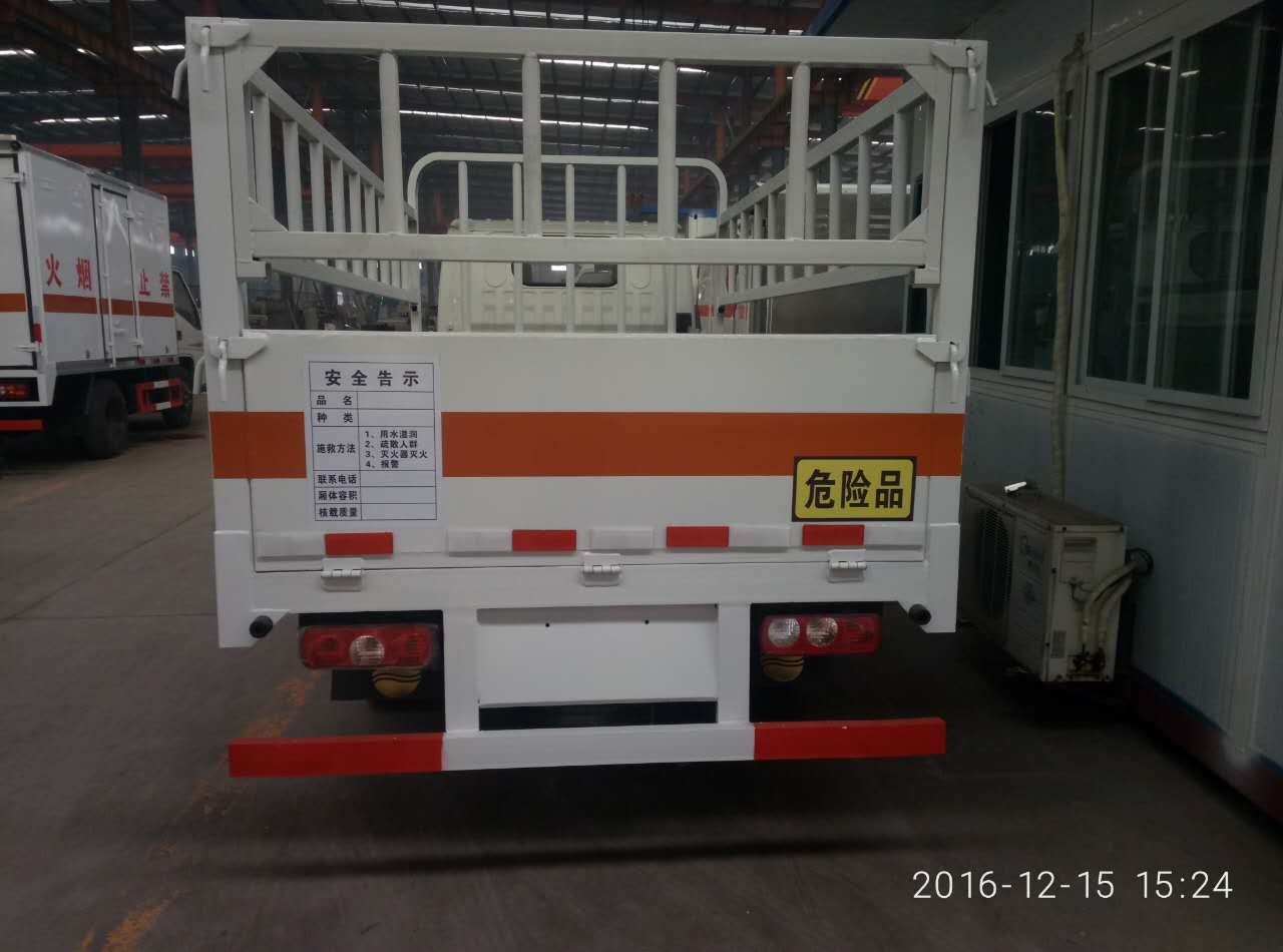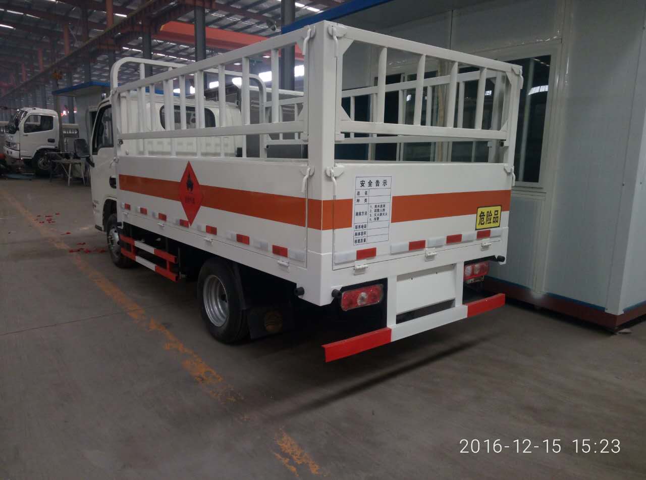 廂體選裝無柵欄,車身側(cè)面及后部粘貼橙色反光標識和標志牌,在車體后部設(shè)置安全標示,運輸具有獨立容器包裝的易燃氣體:液化石油氣,壓縮甲烷或甲烷含量高的壓縮天然氣,乙炔,乙烷,丁烷,丁烯,丙烯,二甲醚,壓縮氫,運輸具有獨立容器包裝的非易燃無毒氣體:二氧化碳,壓縮氧(氮,空氣,氦,氬,氖),運送危險品類項號:2.1,2.2,車輛顏色可選,文字噴涂位置可變化。ABS系統(tǒng)控制器型號為APG3550500A6,ABS系統(tǒng)控制器生產(chǎn)企業(yè)為浙江亞太機電股份有限公司,配裝前輪盤式制動器,安裝限速裝置,限速80km/h,輔助制動裝置,前置消聲器,安裝具有衛(wèi)星定位功能的行駛記錄儀.僅選用子午線輪胎.隨底盤選裝駕駛室.整車長度/后懸/軸距/(mm)對應(yīng)關(guān)系: 5400/1520/2800(mm),5050/1320/2650(mm)。