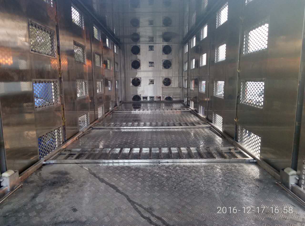 2.車廂內(nèi)部采用全液壓可調(diào)整分層結(jié)構(gòu),共分3層,每層都是不繡鋼鋼架和底板結(jié)構(gòu),都能承重300頭以上仔豬的重量,每層4條液壓缸支撐,并配備相應(yīng)的鎖死結(jié)構(gòu)!