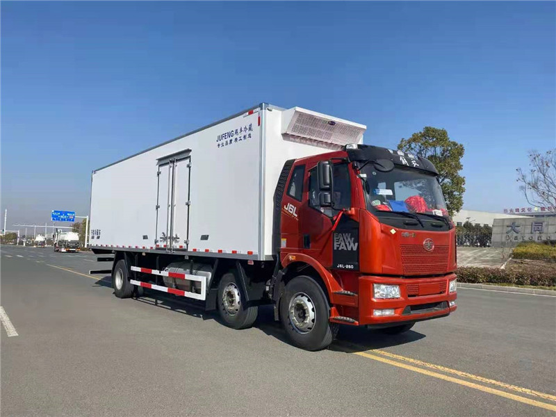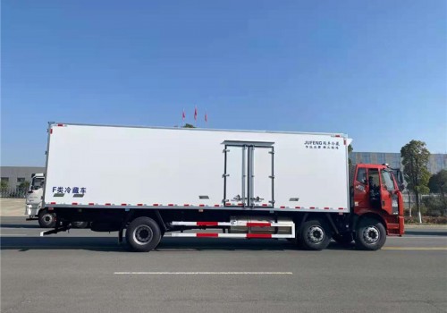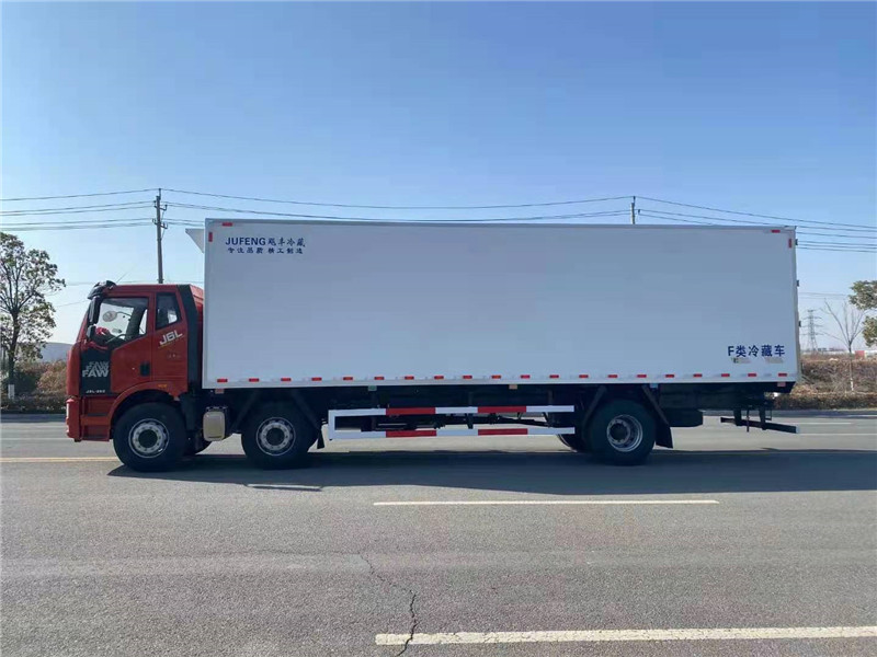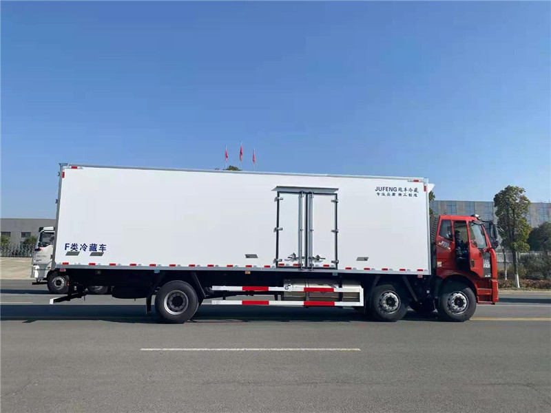 解放天然氣國六9米6冷藏車上裝配置:冷藏箱體內(nèi)尺寸9600×2420×2450(mm),采用木質(zhì)工藝(龍骨連接鑲?cè)氕h(huán)保防水木材起保溫耐腐蝕作用)、斷橋隔熱技術(shù)!保溫效果達(dá)到國家A級標(biāo)準(zhǔn).箱板是由鍍鋅管骨架加上環(huán)保防水木板一次成型,中間8CM保溫板填充、加厚3.0玻璃鋼,高強(qiáng)度粘合劑、熱壓成型,外框采用304不銹鋼、加厚鋁型材包邊、27不銹鋼大門鎖、配件,箱體拼接出來不打膠無縫隙,降溫速度快、散溫慢、保溫效果好,門帶斜邊,副梁是710大梁鋼一次性折成,用壓板鎖緊,側(cè)護(hù)網(wǎng)和后保險(xiǎn)杠一次性成型。
