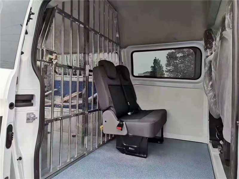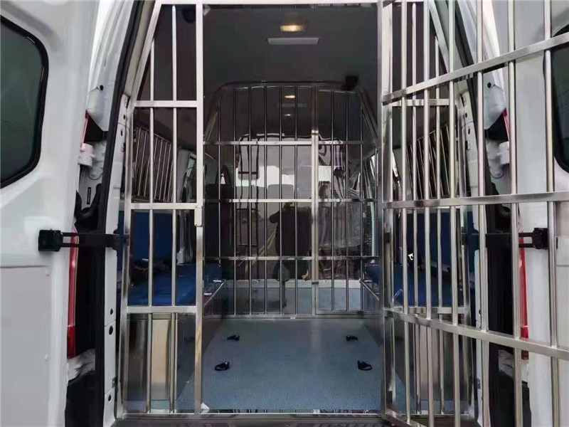 304不銹鋼囚籠 ,2個監(jiān)控攝像頭(前后監(jiān)控),腳鐐固定環(huán) ,長條翻板座椅 ,貼“公安”標(biāo)識 ,警用車外觀標(biāo)識 ,寬后腳踏板。加裝等離子殺菌凈化系統(tǒng) 。