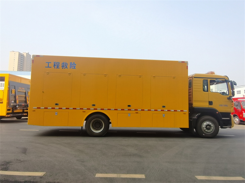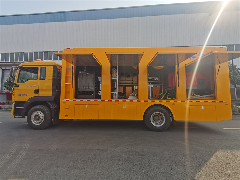 重汽豪沃3000方排澇車(chē)-工程救險(xiǎn)車(chē)標(biāo)準(zhǔn)配置:整車(chē)采用優(yōu)質(zhì)碳鋼方管骨架,1.5mm 厚蒙皮,先進(jìn)的噴涂技術(shù),車(chē)廂整體防銹、防腐使用年限更長(zhǎng),廂體外部鋼材為優(yōu)質(zhì)冷軋鋼板,內(nèi)襯優(yōu)質(zhì)冷軋鋼板折彎骨架,工藝先進(jìn),強(qiáng)度牢固。廂體為全密封結(jié)構(gòu),具備運(yùn)輸、防雨、防腐、防火、防銹要求。車(chē)廂尾部為對(duì)開(kāi)門(mén)。發(fā)電機(jī)組進(jìn)排風(fēng)消聲處理,消聲器做降噪處理。車(chē)輛安裝四只液壓支撐腿,可在駐車(chē)狀態(tài)均分車(chē)輛靜壓,保護(hù)車(chē)輪及彈簧鋼板。選用進(jìn)口優(yōu)質(zhì)多路閥組,液壓支撐缸采用進(jìn)口密封件,單支腿靜載荷 8 噸,加裝雙向液壓鎖。底盤(pán)發(fā)動(dòng)機(jī)全功率取力液壓動(dòng)力源,驅(qū)動(dòng)排水機(jī)器人、液壓油箱、散熱器、水帶液壓卷盤(pán)、液壓油管卷盤(pán)等液壓系統(tǒng)工作。定制分動(dòng)箱,進(jìn)口高壓液壓油泵,高效能轉(zhuǎn)換,平穩(wěn)無(wú)極調(diào)速,為車(chē)輛節(jié)約空間,整車(chē)液壓系統(tǒng)布局合理。