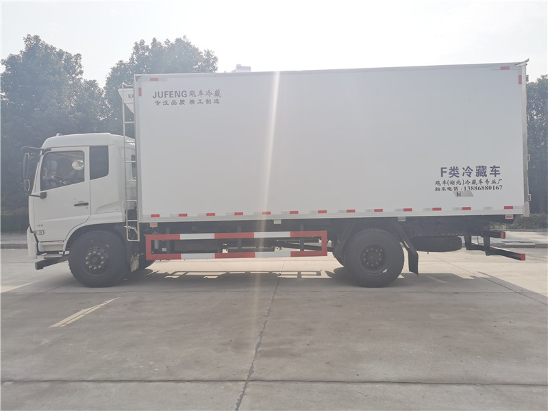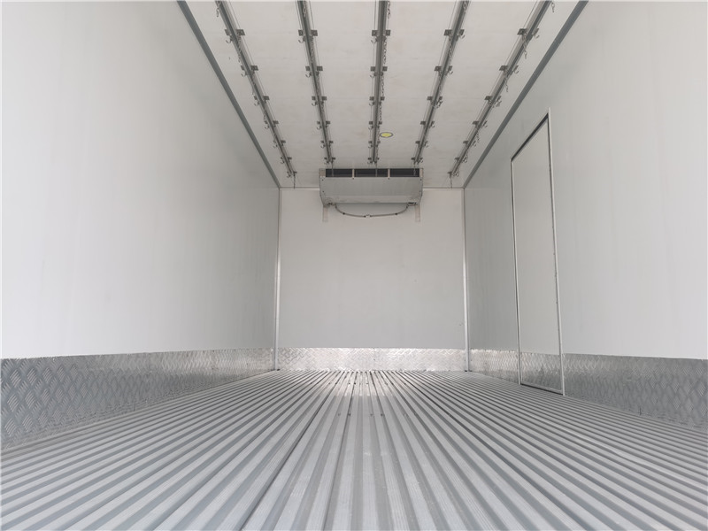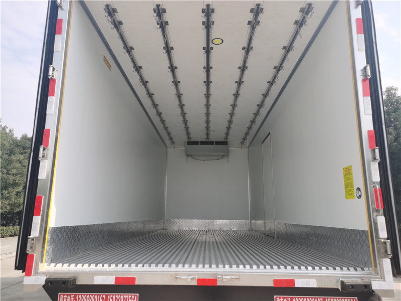3、颶豐冷藏車廠生產(chǎn)線是國際最先進(jìn)18米大型復(fù)合板材生產(chǎn)線,壓板臺(tái)面生產(chǎn)前機(jī)器自動(dòng)吸塵干凈,保證壓板機(jī)一次壓制成型,其生產(chǎn)設(shè)備及技術(shù)均領(lǐng)先同行業(yè)標(biāo)準(zhǔn),箱體外形美觀,整體質(zhì)量輕,強(qiáng)度高,無滲漏特點(diǎn),箱體堅(jiān)固耐用,保溫效果高,保證不鼓包。箱體頂部加裝5排肉鉤導(dǎo)軌,地板加裝 加厚通風(fēng)槽,可走小叉車。